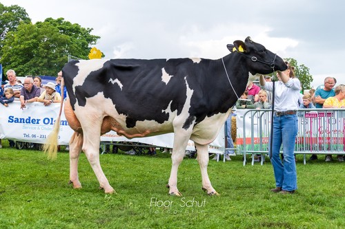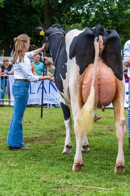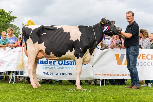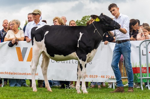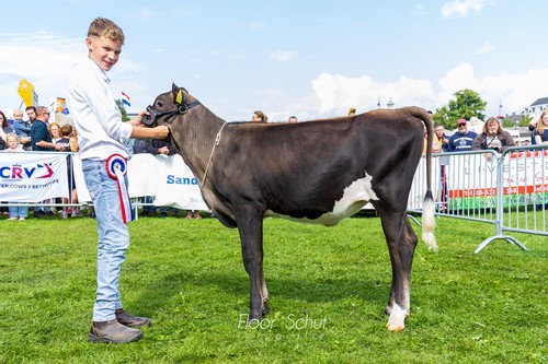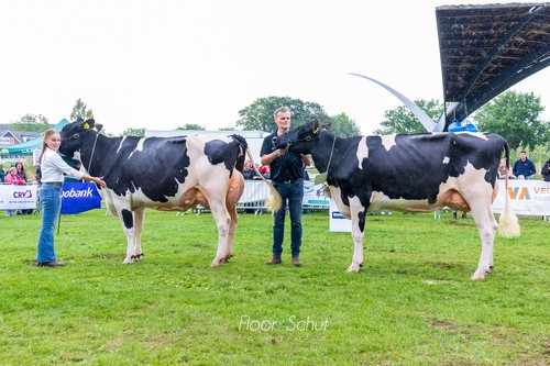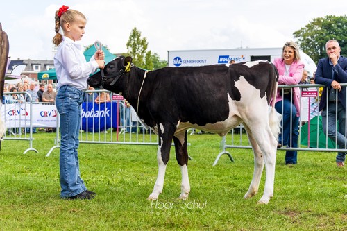 Niet alleen in het melkgevende deelnemersveld, maar ook bij het jongvee wist de combinatie Nijman/Gunnink meerdere bekers te winnen. Als junioren kampioene werd Brown Swiss x Holstein kruizing De Wijde Blik Maray gekroond. Maray is een dochter van de Zwitserdse H U Husers Huge SG Ray. Via meerdere generaties stamt ook zij uit de de Marie 389/Mariegold EX-93 koefamilie! Opgevolgd werd deze 87,5% Brown Swiss door Big Malki-dochter De Wijde Blik Marilino 9 die in drie generaties afstamd van (alweer!) Marie 389! In de klasse met oudere kalveren was de concurrentie groot, toch wist Sandy-Valley Eq-dochter De Wijde Blik Jolein 21 indruk te maken op de concurrentie en ging er met de titel vandoor. Jolein 21 komt uit de Res. Kampioen Oud Bissende Koe van 2024, namelijk De Wijde Blik Jolein 11 (v. AltaRoble)!