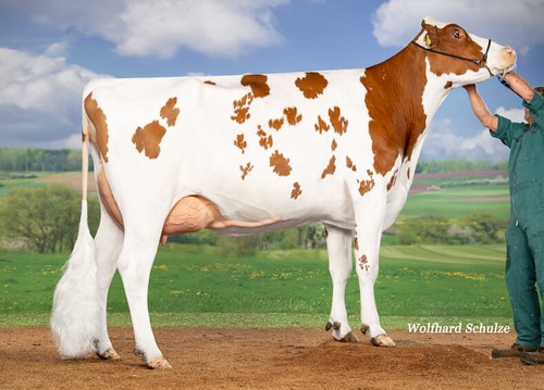 Phinesse PP Red is het enige dubbel hoornloze aanbod in deze veiling. Ze is een dochter van de populaire stiervader THI Rock PP Red en valt op met haar sterke fokwaarden: 153 gRZG, 1712 kg melk (+179 kg vet en eiwit), 122 gRZN en 129 FUN. Daarmee behoort ze momenteel tot de top van homozygoot hoornloze roodbonte vrouwelijke dieren in Duitsland. Bovendien is ze de hoogst geteste homozygoot hoornloze dochter van haar vader Rock PP Red.