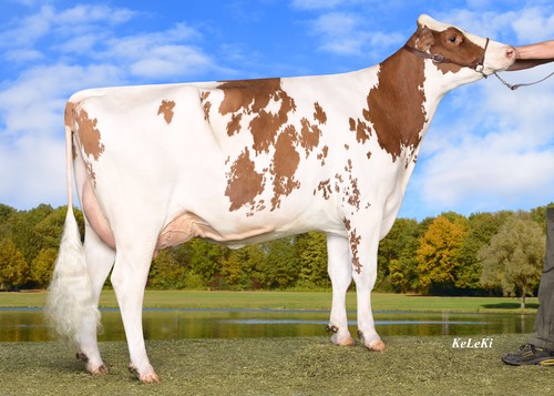 De hoogst ingeschreven melkvaars is Delta Drone PP-Red-dochter Poppe Shania P RDC met VG-87 en maar liefst een maximale score van VG-89 voor uier! Via VG-85 Martin x VG-87 Yoda x VG-85 Mission P RD voert Shania terug naar Wilder Saturn P Red VG-88 (v. Apoll P Red) en stamt daarmee uit de bekende Massia koefamilie, die via de VOST Select Sale bij Poppe terecht is gekomen. Deze lijn is bij de familie Poppe inmiddels uitgegroeid tot een sterke gNVI-lijn met vele toppers in de top lijsten. Zo is zus Poppe Sascha P Red v. Warren P RF de voormalig nr. 1 hoornloos & roodbont vaarskalf voor gNVI. Verder fokt deze koefamilie sterk op eiwit percentage en brengt het sterk exterieur.