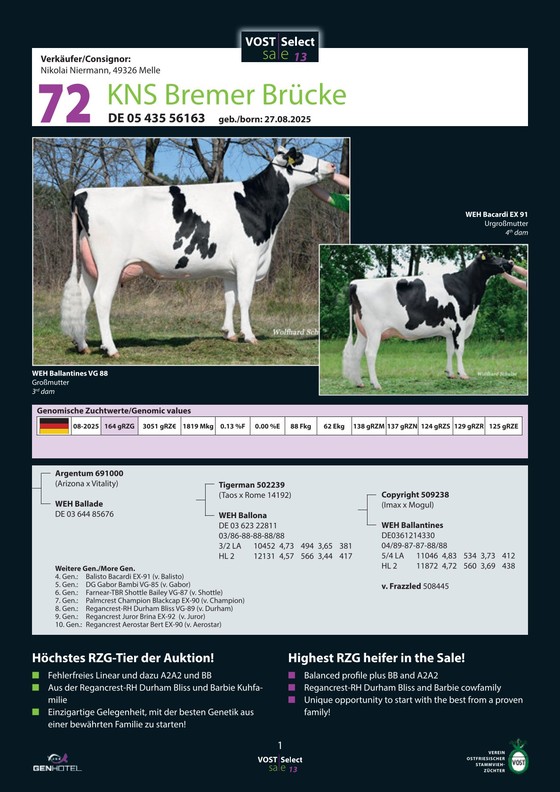 Met indrukwekkende cijfers – 164 gRZG, +150 kg vet + eiwit, 137 gRZN, 124 gRZS, 129 gRZN en 125 gRZE – bevindt dit jonge kalf zich in de top van de Duitse RZG-ranglijsten. De uitslagen voor haar NVI en PFT worden binnenkort verwacht. KNS Bremer Brücke zal tijdens de veiling geveild worden na lot 17.