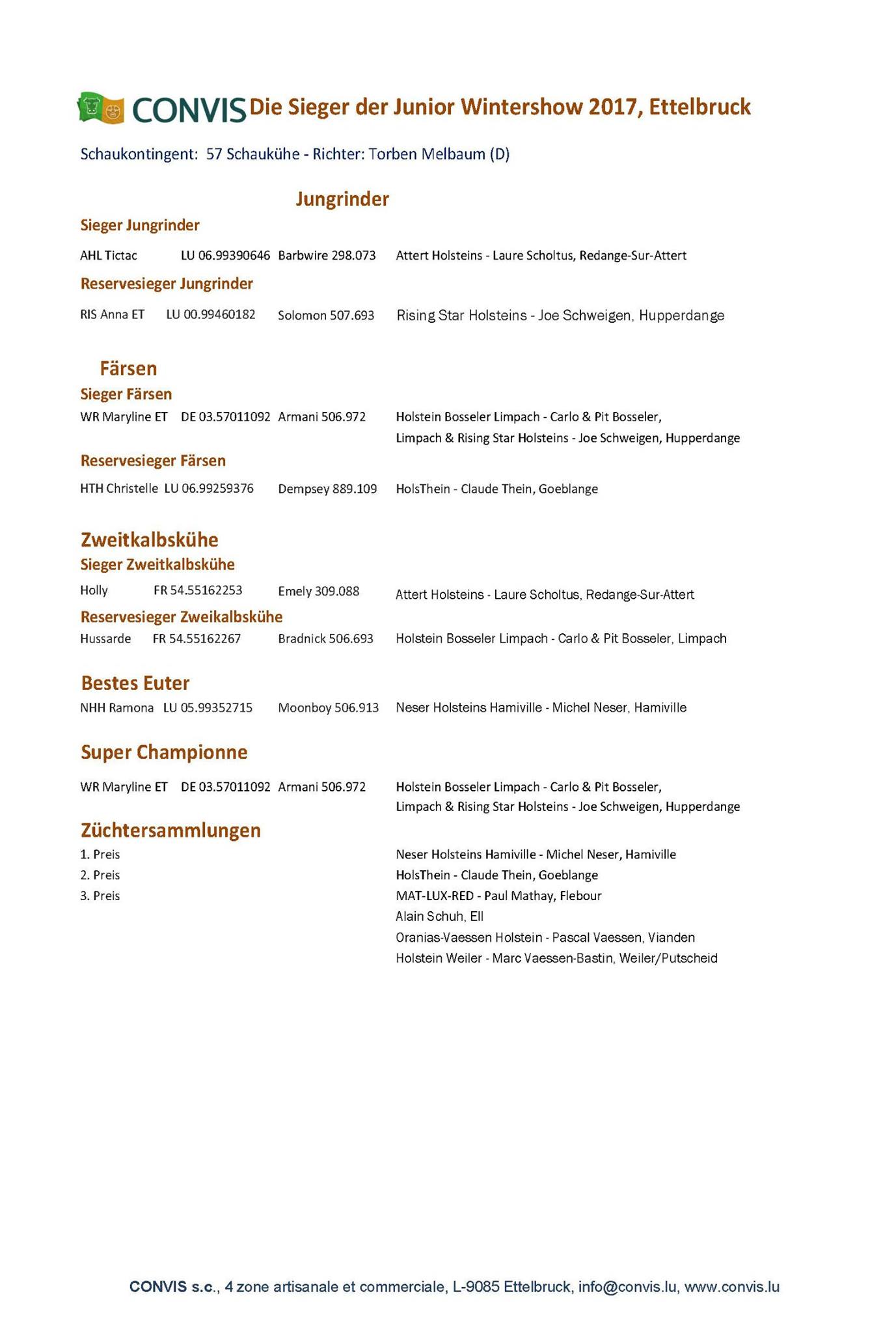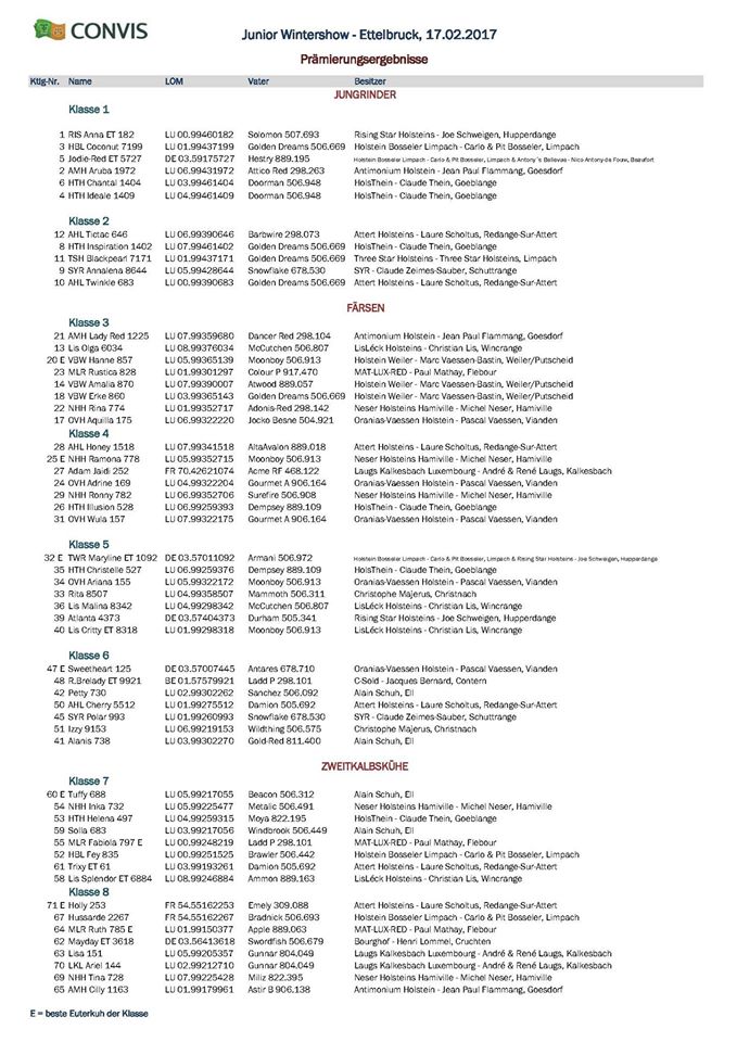 Great success at the Luxembourg Junior Wintershow 2017 in Ettelbruck for Antimonium Holsteins. Their Dancer-Red P daughter AMH Lady-Red P managed to win her class and placed in front of Lis Olga 6034, a McCutchen daughter owned by Lis-Leck Holsteins.