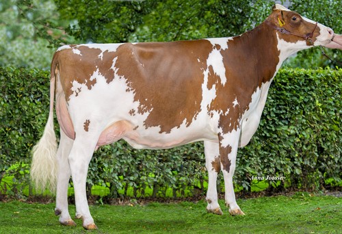 One of the first great-granddaughters of the VG-89 classified Visstein K&L SV Aderina Red has been scored with VG-86 (VG-88 for frame). This Jabido-Red daughter hails via Altitude-Red x VG-86 Marsden P Red from Aderina Red VG-89. This unique brood cow and bull dam is now in her fifth lactation, after freshened again in March. Her lifetime production currently stands at 67,155 kg of milk with a fat percentage of 4.61% and 3.83% protein.