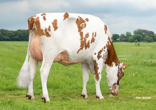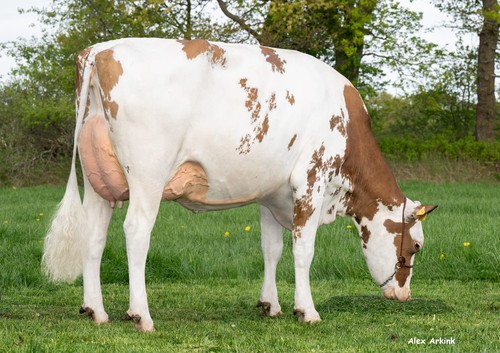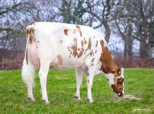 Redford’s lineage traces back six generations to the American brood cow Des-Y-Gen Planet Silk RDC EX-90. His granddam, Schreur Vision Red (Styx Red x Schreur Sunny RDC), was acquired as an embryo by Redford's breeder, Geestland Holsteins. She has since developed into an exceptional dairy and breeding cow with a VG-88 classification. Among her at least nine female descendants, her Trent-Way-Js Ronald RC daughter, GlH Ronald Aura Red, stands out. Aura Red, who was scored as a 2-yr-old with a VG-86 rating, not only produced the top sire GlH Redford but also had five full sisters. Four of these sisters were scored with VG-86 AV (1st lactation), boasting an impressive average udder score of 86.8!